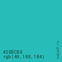 Цвет #28BCB8 в цветовой модели RGB обозначается тремя октетами (40, 188, 184) в десятичном формате и #28BCB8 в шестнадцатиричном (hex) формате, которые являются интенсивностью красного 40 (hex 28), интенсивность зелёного 188 (hex BC) и интенсивность синего 184 (hex B8).
