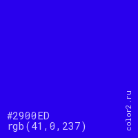 Цвет #2900ED в цветовой модели RGB обозначается тремя октетами (41, 0, 237) в десятичном формате и #2900ED в шестнадцатиричном (hex) формате, которые являются интенсивностью красного 41 (hex 29), интенсивность зелёного 0 (hex 00) и интенсивность синего 237 (hex ED).