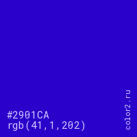 Цвет #2901CA в цветовой модели RGB обозначается тремя октетами (41, 1, 202) в десятичном формате и #2901CA в шестнадцатиричном (hex) формате, которые являются интенсивностью красного 41 (hex 29), интенсивность зелёного 1 (hex 01) и интенсивность синего 202 (hex CA).
