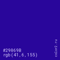 Цвет #29069B в цветовой модели RGB обозначается тремя октетами (41, 6, 155) в десятичном формате и #29069B в шестнадцатиричном (hex) формате, которые являются интенсивностью красного 41 (hex 29), интенсивность зелёного 6 (hex 06) и интенсивность синего 155 (hex 9B).