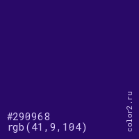 Цвет #290968 в цветовой модели RGB обозначается тремя октетами (41, 9, 104) в десятичном формате и #290968 в шестнадцатиричном (hex) формате, которые являются интенсивностью красного 41 (hex 29), интенсивность зелёного 9 (hex 09) и интенсивность синего 104 (hex 68).