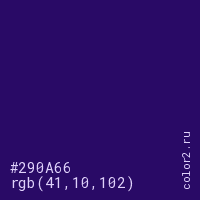 Цвет #290A66 в цветовой модели RGB обозначается тремя октетами (41, 10, 102) в десятичном формате и #290A66 в шестнадцатиричном (hex) формате, которые являются интенсивностью красного 41 (hex 29), интенсивность зелёного 10 (hex 0A) и интенсивность синего 102 (hex 66).