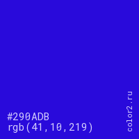 Цвет #290ADB в цветовой модели RGB обозначается тремя октетами (41, 10, 219) в десятичном формате и #290ADB в шестнадцатиричном (hex) формате, которые являются интенсивностью красного 41 (hex 29), интенсивность зелёного 10 (hex 0A) и интенсивность синего 219 (hex DB).