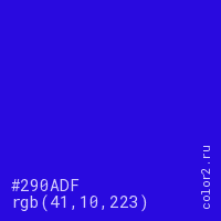 Цвет #290ADF в цветовой модели RGB обозначается тремя октетами (41, 10, 223) в десятичном формате и #290ADF в шестнадцатиричном (hex) формате, которые являются интенсивностью красного 41 (hex 29), интенсивность зелёного 10 (hex 0A) и интенсивность синего 223 (hex DF).