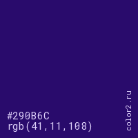 Цвет #290B6C в цветовой модели RGB обозначается тремя октетами (41, 11, 108) в десятичном формате и #290B6C в шестнадцатиричном (hex) формате, которые являются интенсивностью красного 41 (hex 29), интенсивность зелёного 11 (hex 0B) и интенсивность синего 108 (hex 6C).