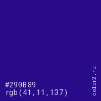Цвет #290B89 в цветовой модели RGB обозначается тремя октетами (41, 11, 137) в десятичном формате и #290B89 в шестнадцатиричном (hex) формате, которые являются интенсивностью красного 41 (hex 29), интенсивность зелёного 11 (hex 0B) и интенсивность синего 137 (hex 89).