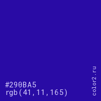Цвет #290BA5 в цветовой модели RGB обозначается тремя октетами (41, 11, 165) в десятичном формате и #290BA5 в шестнадцатиричном (hex) формате, которые являются интенсивностью красного 41 (hex 29), интенсивность зелёного 11 (hex 0B) и интенсивность синего 165 (hex A5).