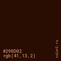 Цвет #290D02 в цветовой модели RGB обозначается тремя октетами (41, 13, 2) в десятичном формате и #290D02 в шестнадцатиричном (hex) формате, которые являются интенсивностью красного 41 (hex 29), интенсивность зелёного 13 (hex 0D) и интенсивность синего 2 (hex 02).