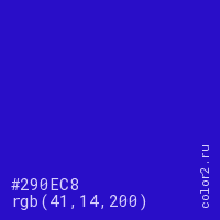 Цвет #290EC8 в цветовой модели RGB обозначается тремя октетами (41, 14, 200) в десятичном формате и #290EC8 в шестнадцатиричном (hex) формате, которые являются интенсивностью красного 41 (hex 29), интенсивность зелёного 14 (hex 0E) и интенсивность синего 200 (hex C8).