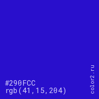 Цвет #290FCC в цветовой модели RGB обозначается тремя октетами (41, 15, 204) в десятичном формате и #290FCC в шестнадцатиричном (hex) формате, которые являются интенсивностью красного 41 (hex 29), интенсивность зелёного 15 (hex 0F) и интенсивность синего 204 (hex CC).