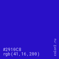 Цвет #2910C8 в цветовой модели RGB обозначается тремя октетами (41, 16, 200) в десятичном формате и #2910C8 в шестнадцатиричном (hex) формате, которые являются интенсивностью красного 41 (hex 29), интенсивность зелёного 16 (hex 10) и интенсивность синего 200 (hex C8).
