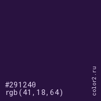 Цвет #291240 в цветовой модели RGB обозначается тремя октетами (41, 18, 64) в десятичном формате и #291240 в шестнадцатиричном (hex) формате, которые являются интенсивностью красного 41 (hex 29), интенсивность зелёного 18 (hex 12) и интенсивность синего 64 (hex 40).