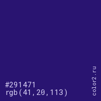 Цвет #291471 в цветовой модели RGB обозначается тремя октетами (41, 20, 113) в десятичном формате и #291471 в шестнадцатиричном (hex) формате, которые являются интенсивностью красного 41 (hex 29), интенсивность зелёного 20 (hex 14) и интенсивность синего 113 (hex 71).