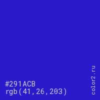 Цвет #291ACB в цветовой модели RGB обозначается тремя октетами (41, 26, 203) в десятичном формате и #291ACB в шестнадцатиричном (hex) формате, которые являются интенсивностью красного 41 (hex 29), интенсивность зелёного 26 (hex 1A) и интенсивность синего 203 (hex CB).