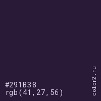 Цвет #291B38 в цветовой модели RGB обозначается тремя октетами (41, 27, 56) в десятичном формате и #291B38 в шестнадцатиричном (hex) формате, которые являются интенсивностью красного 41 (hex 29), интенсивность зелёного 27 (hex 1B) и интенсивность синего 56 (hex 38).
