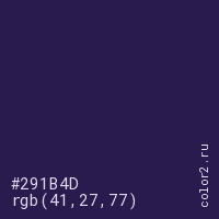 Цвет #291B4D в цветовой модели RGB обозначается тремя октетами (41, 27, 77) в десятичном формате и #291B4D в шестнадцатиричном (hex) формате, которые являются интенсивностью красного 41 (hex 29), интенсивность зелёного 27 (hex 1B) и интенсивность синего 77 (hex 4D).