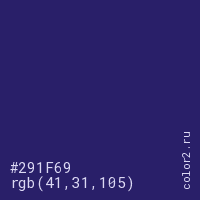 Цвет #291F69 в цветовой модели RGB обозначается тремя октетами (41, 31, 105) в десятичном формате и #291F69 в шестнадцатиричном (hex) формате, которые являются интенсивностью красного 41 (hex 29), интенсивность зелёного 31 (hex 1F) и интенсивность синего 105 (hex 69).
