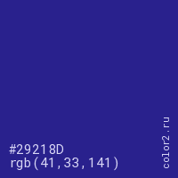 Цвет #29218D в цветовой модели RGB обозначается тремя октетами (41, 33, 141) в десятичном формате и #29218D в шестнадцатиричном (hex) формате, которые являются интенсивностью красного 41 (hex 29), интенсивность зелёного 33 (hex 21) и интенсивность синего 141 (hex 8D).