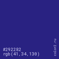 Цвет #292282 в цветовой модели RGB обозначается тремя октетами (41, 34, 130) в десятичном формате и #292282 в шестнадцатиричном (hex) формате, которые являются интенсивностью красного 41 (hex 29), интенсивность зелёного 34 (hex 22) и интенсивность синего 130 (hex 82).