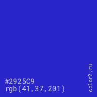 Цвет #2925C9 в цветовой модели RGB обозначается тремя октетами (41, 37, 201) в десятичном формате и #2925C9 в шестнадцатиричном (hex) формате, которые являются интенсивностью красного 41 (hex 29), интенсивность зелёного 37 (hex 25) и интенсивность синего 201 (hex C9).