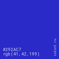 Цвет #292AC7 в цветовой модели RGB обозначается тремя октетами (41, 42, 199) в десятичном формате и #292AC7 в шестнадцатиричном (hex) формате, которые являются интенсивностью красного 41 (hex 29), интенсивность зелёного 42 (hex 2A) и интенсивность синего 199 (hex C7).