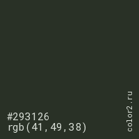 Цвет #293126 в цветовой модели RGB обозначается тремя октетами (41, 49, 38) в десятичном формате и #293126 в шестнадцатиричном (hex) формате, которые являются интенсивностью красного 41 (hex 29), интенсивность зелёного 49 (hex 31) и интенсивность синего 38 (hex 26).