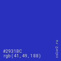 Цвет #2931BC в цветовой модели RGB обозначается тремя октетами (41, 49, 188) в десятичном формате и #2931BC в шестнадцатиричном (hex) формате, которые являются интенсивностью красного 41 (hex 29), интенсивность зелёного 49 (hex 31) и интенсивность синего 188 (hex BC).