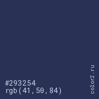 Цвет #293254 в цветовой модели RGB обозначается тремя октетами (41, 50, 84) в десятичном формате и #293254 в шестнадцатиричном (hex) формате, которые являются интенсивностью красного 41 (hex 29), интенсивность зелёного 50 (hex 32) и интенсивность синего 84 (hex 54).