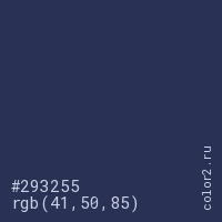 Цвет #293255 в цветовой модели RGB обозначается тремя октетами (41, 50, 85) в десятичном формате и #293255 в шестнадцатиричном (hex) формате, которые являются интенсивностью красного 41 (hex 29), интенсивность зелёного 50 (hex 32) и интенсивность синего 85 (hex 55).