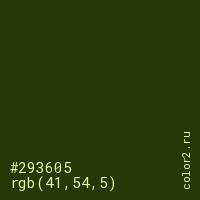 Цвет #293605 в цветовой модели RGB обозначается тремя октетами (41, 54, 5) в десятичном формате и #293605 в шестнадцатиричном (hex) формате, которые являются интенсивностью красного 41 (hex 29), интенсивность зелёного 54 (hex 36) и интенсивность синего 5 (hex 05).