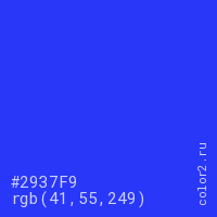 Цвет #2937F9 в цветовой модели RGB обозначается тремя октетами (41, 55, 249) в десятичном формате и #2937F9 в шестнадцатиричном (hex) формате, которые являются интенсивностью красного 41 (hex 29), интенсивность зелёного 55 (hex 37) и интенсивность синего 249 (hex F9).