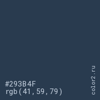 Цвет #293B4F в цветовой модели RGB обозначается тремя октетами (41, 59, 79) в десятичном формате и #293B4F в шестнадцатиричном (hex) формате, которые являются интенсивностью красного 41 (hex 29), интенсивность зелёного 59 (hex 3B) и интенсивность синего 79 (hex 4F).