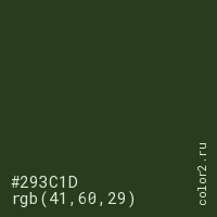 Цвет #293C1D в цветовой модели RGB обозначается тремя октетами (41, 60, 29) в десятичном формате и #293C1D в шестнадцатиричном (hex) формате, которые являются интенсивностью красного 41 (hex 29), интенсивность зелёного 60 (hex 3C) и интенсивность синего 29 (hex 1D).