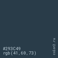 Цвет #293C49 в цветовой модели RGB обозначается тремя октетами (41, 60, 73) в десятичном формате и #293C49 в шестнадцатиричном (hex) формате, которые являются интенсивностью красного 41 (hex 29), интенсивность зелёного 60 (hex 3C) и интенсивность синего 73 (hex 49).