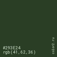 Цвет #293E24 в цветовой модели RGB обозначается тремя октетами (41, 62, 36) в десятичном формате и #293E24 в шестнадцатиричном (hex) формате, которые являются интенсивностью красного 41 (hex 29), интенсивность зелёного 62 (hex 3E) и интенсивность синего 36 (hex 24).