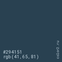 Цвет #294151 в цветовой модели RGB обозначается тремя октетами (41, 65, 81) в десятичном формате и #294151 в шестнадцатиричном (hex) формате, которые являются интенсивностью красного 41 (hex 29), интенсивность зелёного 65 (hex 41) и интенсивность синего 81 (hex 51).