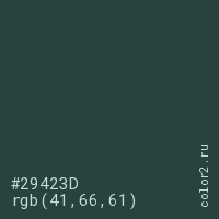 Цвет #29423D в цветовой модели RGB обозначается тремя октетами (41, 66, 61) в десятичном формате и #29423D в шестнадцатиричном (hex) формате, которые являются интенсивностью красного 41 (hex 29), интенсивность зелёного 66 (hex 42) и интенсивность синего 61 (hex 3D).