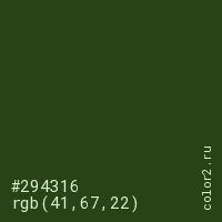 Цвет #294316 в цветовой модели RGB обозначается тремя октетами (41, 67, 22) в десятичном формате и #294316 в шестнадцатиричном (hex) формате, которые являются интенсивностью красного 41 (hex 29), интенсивность зелёного 67 (hex 43) и интенсивность синего 22 (hex 16).