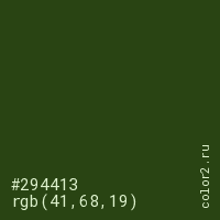 Цвет #294413 в цветовой модели RGB обозначается тремя октетами (41, 68, 19) в десятичном формате и #294413 в шестнадцатиричном (hex) формате, которые являются интенсивностью красного 41 (hex 29), интенсивность зелёного 68 (hex 44) и интенсивность синего 19 (hex 13).