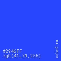 Цвет #2946FF в цветовой модели RGB обозначается тремя октетами (41, 70, 255) в десятичном формате и #2946FF в шестнадцатиричном (hex) формате, которые являются интенсивностью красного 41 (hex 29), интенсивность зелёного 70 (hex 46) и интенсивность синего 255 (hex FF).