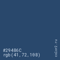 Цвет #29486C в цветовой модели RGB обозначается тремя октетами (41, 72, 108) в десятичном формате и #29486C в шестнадцатиричном (hex) формате, которые являются интенсивностью красного 41 (hex 29), интенсивность зелёного 72 (hex 48) и интенсивность синего 108 (hex 6C).