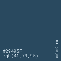 Цвет #29495F в цветовой модели RGB обозначается тремя октетами (41, 73, 95) в десятичном формате и #29495F в шестнадцатиричном (hex) формате, которые являются интенсивностью красного 41 (hex 29), интенсивность зелёного 73 (hex 49) и интенсивность синего 95 (hex 5F).