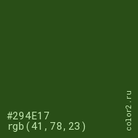 Цвет #294E17 в цветовой модели RGB обозначается тремя октетами (41, 78, 23) в десятичном формате и #294E17 в шестнадцатиричном (hex) формате, которые являются интенсивностью красного 41 (hex 29), интенсивность зелёного 78 (hex 4E) и интенсивность синего 23 (hex 17).