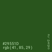 Цвет #29551D в цветовой модели RGB обозначается тремя октетами (41, 85, 29) в десятичном формате и #29551D в шестнадцатиричном (hex) формате, которые являются интенсивностью красного 41 (hex 29), интенсивность зелёного 85 (hex 55) и интенсивность синего 29 (hex 1D).