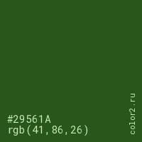 Цвет #29561A в цветовой модели RGB обозначается тремя октетами (41, 86, 26) в десятичном формате и #29561A в шестнадцатиричном (hex) формате, которые являются интенсивностью красного 41 (hex 29), интенсивность зелёного 86 (hex 56) и интенсивность синего 26 (hex 1A).