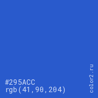 Цвет #295ACC в цветовой модели RGB обозначается тремя октетами (41, 90, 204) в десятичном формате и #295ACC в шестнадцатиричном (hex) формате, которые являются интенсивностью красного 41 (hex 29), интенсивность зелёного 90 (hex 5A) и интенсивность синего 204 (hex CC).