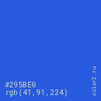 Цвет #295BE0 в цветовой модели RGB обозначается тремя октетами (41, 91, 224) в десятичном формате и #295BE0 в шестнадцатиричном (hex) формате, которые являются интенсивностью красного 41 (hex 29), интенсивность зелёного 91 (hex 5B) и интенсивность синего 224 (hex E0).