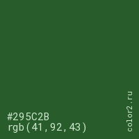 Цвет #295C2B в цветовой модели RGB обозначается тремя октетами (41, 92, 43) в десятичном формате и #295C2B в шестнадцатиричном (hex) формате, которые являются интенсивностью красного 41 (hex 29), интенсивность зелёного 92 (hex 5C) и интенсивность синего 43 (hex 2B).
