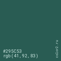 Цвет #295C53 в цветовой модели RGB обозначается тремя октетами (41, 92, 83) в десятичном формате и #295C53 в шестнадцатиричном (hex) формате, которые являются интенсивностью красного 41 (hex 29), интенсивность зелёного 92 (hex 5C) и интенсивность синего 83 (hex 53).