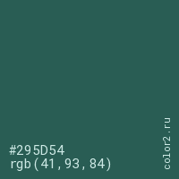Цвет #295D54 в цветовой модели RGB обозначается тремя октетами (41, 93, 84) в десятичном формате и #295D54 в шестнадцатиричном (hex) формате, которые являются интенсивностью красного 41 (hex 29), интенсивность зелёного 93 (hex 5D) и интенсивность синего 84 (hex 54).
